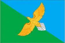 Прямоугольное полотнище с отношением ширины к длине 2:3, разделённое по нисходящей диагонали на две равные части: зелёную у древка и голубую и несущее поверх линии деления, изображение жёлтого с белым хвостом летящего видимого со спины орла.