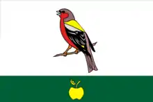 «В серебряном поле над зелёной оконечностью, обременённой золотым яблоком с листком — пурпурный зяблик с лазоревой головой (при этом с пурпурными бровями, щеками и горлом) и плечами и с чёрными глазами, открытым клювом, лапами, крыльями (имеющими две выгнутые к концу крыльев серебряные полосы, верхняя из которых пролегает вплотную к лазури на плече) и хвостом, сидящий на зелёной части ветви (без листьев) в перевязь».