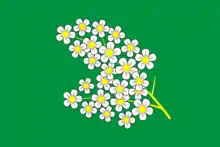 В центре зелёного полотнища помещено изображение ветки черёмухи: на жёлтом стебле цветки с белыми лепестками и жёлтыми сердцевинами. Габаритные размеры изображения составляют 1/2 длины и 3/4 ширины полотнища.