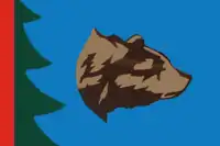 «Прямоугольное красное полотнище с соотношением ширины к длине 2:3, несущее вдоль нижнего края зелёную выпуклую полосу (шириной у краёв полотнища — 1/9 ширины полотнища, а в середине — 1/4 ширины полотнища) и воспроизводящее в середине изображение сидящего жёлтого медведя держащего жёлто-оранжевую исполинскую шишку (из герба поселения)».