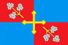 «Прямоугольное полотнище с отношением ширины к длине 2:3, разделённое крестообразно на четверо — красное и голубое у древка и голубое и красное у свободного края. На пересечении линий деления — изображение равноконечного жёлтого креста с трилистными концами; красные четверти несут изображение наклонённых от центра полотнища жёлтых яблоневых веток с белыми цветами».