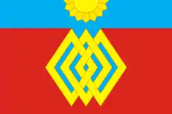 «Прямоугольное двухстороннее красное полотнище с отношением ширины к длине 2:3, несущее вдоль верхнего края голубую полосу шириной 1/5 ширины полотнища; в середине полотнища воспроизведены фигуры из герба поселения: на красной части полотнища, вплотную к полосе — три переплетённых жёлтых ромба (поле внутри веретён и между веретёнами и верхней полосой — голубое), а на голубой полосе — выходящее сверху жёлтое солнце».