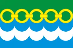 «Полотнище, состоящее из пяти горизонтальных полос различной формы и величины. Горизонтальные полосы — зелёная, фигурная жёлтая в виде стилизованной цепи из пяти колец, отверстия которых заполнены зелёным цветом (диаметр кольца — 3/10 ширины полотнища, от верхнего края до середины цепи — 2/5 ширины полотнища) и далее равные по ширине голубая, белая и голубая, разделённые линиями, повторяющими нижний контур цепи».
