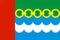 «Прямоугольное полотнище с отношением ширины к длине 2:3, состоящее из двух вертикальных полос: красной, шириной 1/4 длины полотнища, и части, состоящей из пяти горизонтальных полос различной формы и величины. Горизонтальные полосы — зелёная, фигурная жёлтая в виде стилизованной цепи, отверстия которой заполнены зелёным цветом (диаметр кольца — 3/10 ширины полотнища, от верхнего края до середины цепи — 1/3 ширины полотнища), и далее равные по ширине голубая, белая и голубая, разделённые линиями, повторяющими нижний контур цепи».