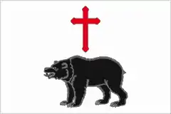 «Прямоугольное полотнище белого цвета с отношением ширины к длине 2:3, в центре которого — смещённый вверх трилистный крест красного цвета с удлинённым нижним концом, и под ним — стоящий на четырёх лапах головой к древку медведь чёрного цвета».