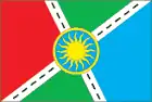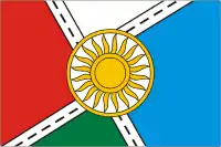 «Прямоугольное двухстороннее полотнище с отношением ширины к длине 2:3, разделено по диагонали на четыре части — верхнюю белую, красную вдоль древка, лазоревую у свободного края и зелёную у свободного края белым косым крестом с чёрными узкими прямоугольниками; в центре полотнища воспроизведено жёлтое кольцо, обременённое жёлтым пламенеющим солнцем, заполненное белым».