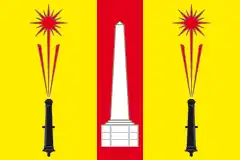 Геральдическое описание герба гласит: «В золотом поле червлёный столб, обременённый серебряным обелиском и сопровождённый по сторонам чёрными пушками (без лафетов) в столб, от жерл которых веерообразно разлетаются червлёные искры, по три у каждой пушки, причём средняя искра завершена звездой с шестнадцатью длинными и короткими лучами попеременно (из которых нижний длинный скрыт самою искрой)».