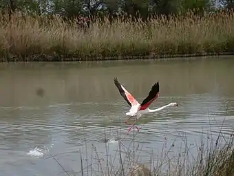 Фламинго предпочитают крупные мелководные озёра и лагуны, ширина которых может достигать 80 км. Водоёмы могут быть солёными или щелочными, со значением pH до 10,5[24] и солёностью, более чем в два раза превышающую солёность океана[26]. Как правило, они лишены растительности и окружены пустынной почвой, особенно в местах размножения. Фламинго очень устойчивы к едким условиям, могут обитать в местах с высоким содержанием хлоридов, карбоната натрия, сульфатов и фторидов. Их всё чаще можно встретить и в пресной воде. Эта тенденция была отмечена в 1975 году в Камарге на юге Франции и, возможно, связана с ростом популяции розового фламинго. Исключение составляют красные фламинго с Галапагосских островов, которые предпочитают небольшие солёные лагуны. Розовые фламинго могут обитать в мангровых болотах и соляных отстойниках, гнездиться в водоёмах с высокой солёностью, например в Фри-Стейт в ЮАР, или на песчаных островах приливных равнин залива Габес в Тунисе и Банк-д’Арген в Мавритании[24].