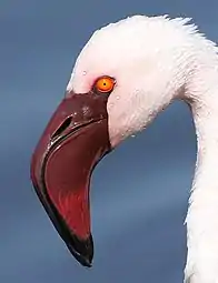 Клюв фламинго очень крупный относительно головы[11], он почти под прямым углом «коленообразно» загнут вниз в средней части[12][10][11], может иметь красно-коричневый, беловатый, розовый или жёлтый цвет, кончик клюва всегда чёрный[7]. Массивный клюв имеет пористую конструкцию, что делает его легче и даже позволяет ему плавать по поверхности воды[13]. Ноздри сквозные. Большая часть плоского надклювья образована верхнечелюстной костью, а не предчелюстной, как у гусеобразных. Подклювье объёмное и вогнутое, язык большой и мясистый[2]. Самый конец подклювья сужается и образует своего рода воронку, необходимую для кормления птенцов[13]. Края клюва и языка покрыты многочисленными роговыми пластинами. Такое строение позволяет фламинго процеживать планктон[12][14][2]. Разные количество, размер и расположение пластинок позволяют симпатричным видам питаться разной пищей и избегать конкуренции[9]. На узком кольце вокруг глаз, уздечке и подбородке оперение отсутствует[12][10], эти места по-разному окрашены в зависимости от вида[10] и контрастируют по цвету с остальными частями головы и клювом[7]. Радужина глаза жёлтая или красноватая[7].