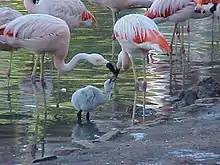 Привязка птенца фламинго к родителям наступает ещё до того, как он вылупился из яйца, когда птенец в яйце начинает издавать звуковые сигналы. У красного, розового, чилийского и малого фламинго этот момент наступает на 26 день инкубации или чуть раньше. После этого не рекомендуется забирать яйцо или птенца от родителей[26]. Фламинго кормят птенцов «молоком». У розовых фламинго в неволе этот корм содержит 15 % жиров, 8—9 % белков и 0,1—0,2 % углеводов[27].
