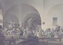 Ф. Флейшман. Художник Фридрих Флейшман в пивном погребке в кругу своих мюнхенских коллег по искусству. 1834, акварель