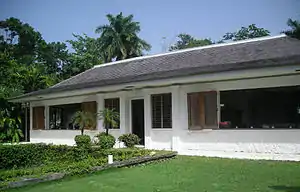 В 1942 году Флеминг участвовал в англо-американском саммите разведывательных служб на Ямайке и, несмотря на дождливую погоду во время саммита, решил после войны поселиться на острове[75]. Друг Флеминга, Ивар Брайс, помог ему найти земельный участок в приходе Сент-Мэри, где в 1945 году был построен дом, названный «Золотой глаз». Происхождение названия дома и поместья, где Флеминг писал романы о Бонде, спорно. Сам Флеминг говорил, что название было дано одновременно в честь военной операции Goldeneye и романа Карсон Маккалерс «Блики в Золотом глазу», в котором описано использование американских флотом британских военно-морских баз в Карибском бассейне[76].