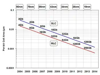 Уменьшение техпроцесса позволяло быстро наращивать объёмы чипов памяти NAND-флеш. В 2000 году флеш-память по технологии 180 нм имела объём данных в 512 Мбит на кристалл, в 2005 — 2 Гбит при 90 нм. Затем произошёл переход на MLC, и в 2008 чипы имели объём 8 Гбит (65 нм)[34]. На 2010 год около 25—35 % чипов имели размер 16 Гбит, 55 % — 32 Гбит[35]. В 2012—2014 годах в новых продуктах широко использовались кристаллы объёмом 64 Гбит, и начиналось внедрение 128-Гбитовых модулей (10 % на начало 2014 года), изготовленных по техпроцессам 24—19 нм[34][35].