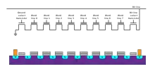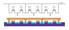 Схемотехника NAND оказалась удобна для построения вертикальной компоновки блока ячеек на кристалле[11][12][13]. На кристалл послойно напыляют проводящие и изолирующие слои, которые образуют проводники затворов и сами затворы. Затем в этих слоях формируют множество отверстий на всю глубину слоев. На стенки отверстий наносят структуру полевых транзисторов — изоляторы и плавающие затворы. Таким образом формируют столбец кольцеобразных полевых транзисторов с плавающими затворами.