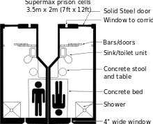 Большая часть камерной обстановки целиком сделана из литого бетона, включая стол, стул и койку. В каждой камере есть туалет, перекрывающийся, если он закупорен, душ, оснащённый таймером (для предотвращения возможности затопления) и раковиной без крана, который считается потенциально опасным. Комнаты также могут быть оборудованы зеркалом из полированной стали, прикрученным болтами к стене, электрическим освещением, радио и телевизором, показывающим развлекательные, образовательные и религиозные программы[6]. Эти привилегии могут дароваться в случае отсутствия проступков. Окна размером в 10 × 120 см разработаны так, чтобы заключённый не мог определить своё местоположение в тюремном комплексе, он видит только небо и крышу над окном, что ещё более усложняет возможность побега[7]. Связь через телекоммуникации с внешним миром запрещена. Пищу доставляют вручную тюремщики.