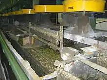 - Машины прямоточные — представляют собой жёлоб, разделённый рядом поперечных перегородок на отдельные отсеки. Перегородки не доходят до дна, а верхняя часть находится ниже уровня пульпы. В разгрузочном конце отсека имеется разгрузочная коробка для регулировки уровня пульпы.