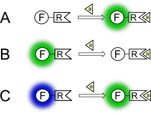 Флуоресцентный зонд может по-разному изменять флуоресценцию при связывании с аналитом, что схематично показано на рисунке: флуоресценция может расти (случай А), угасать (В) или полностью изменить один из параметров, например, цвет (случай С).