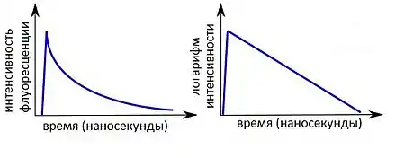 | Время жизни флуоресценции | Для каждого флуоресцентного соединения можно измерить величину, которая имеет размерность времени и имеет название «время жизни флуоресценции». Это величина порядка наносекунд для большинства флюорофоров. Она показывает усреднённое время существования молекулы в возбуждённом состоянии. Если построить график затухания флуоресценции во времени, он будет иметь вид экспоненциальной кривой. В простейшем случае падение будет моноэкспоненцальным, то есть будет иметь вид прямой в логарифмических координатах.