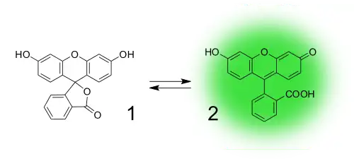 Другой особенностью малых органических флюорофоров является то, что их флуоресценцию можно «включать» с помощью минимальных изменений в химической структуре. Это широко используется в создании флуоресцентных зондов на основе таких молекул. Примером является флуоресцеин, который может существовать в форме двух таутомеров: в нефлуоресцентной лактонной форме и флуоресцентной открытой форме.