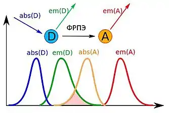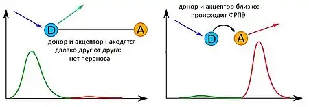 | Фёрстеровский резонансный перенос энергии (ФРПЭ) | Фёрстеровский резонансный перенос энергии (ФРПЭ) (англ. Förster resonance energy transfer, FRET) — процесс, в котором принимает участие два флюорофора, донор (D) и акцептор (A) переноса. Во время ФРПЭ происходит перенос энергии от одного флюорофора к другому. То есть, возбуждая одну молекулу (донор), можно наблюдать флуоресценцию с другой (акцептора).