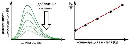 | Тушение флуоресценции | Иногда интенсивность флуоресценции существенно уменьшается при наличии определённых соединений в растворе. Такое явление называется тушение флуоресценции, а соединения, которые его вызывают — гасителями, тушителями (англ. quencher)![]() Классическим примером является кислород, который является гасителем для большого количества органических флюорофоров[1]. Математически тушение флуоресценции описывается уравнением Штерна — Фольмера. Здесь — отношение начальной флуоресценции к флуоресценции в присутствии гасителя; — константа Штерна — Фольмера; — концентрация гасителя. График в координатах — называется графиком Штерна — Фольмера. Тушение бывает статическим и динамическим. При статическом тушении флюорофор в основном электронном состоянии образует нефлуоресцентный комплекс с гасителем. При динамическом тушении образуется обычное возбуждённое состояние, которое разрушается гасителем ещё до того, как успевает произойти флуоресцентная эмиссия[1]. Эксперименты с тушением флуоресценции триптофана акриламидом часто используются для анализа конформации белковых молекул[1]. Кроме того, тушение органических флюорофоров используется при разработке флуоресцентных зондов[11] |