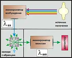Основными приборами для изучения флуоресценции в лабораторных условиях являются спектрофлуориметры[12]. Сильно упрощённая схема такого прибора показана на рисунке. В спектрофлуориметрах используют различные источники света, чаще всего ксеноновые лампы высокого давления. Они дают широкий спектр эмиссии (от ультрафиолетового до инфракрасного света). Излучение от лампы поступает к монохроматору возбуждения, который даёт на выходе свет с определённой нужной длиной волны . После этого монохроматический луч направляется на образец, вызывая его флуоресценцию. Важным является то, что флуоресцентная эмиссия изотропна, то есть её интенсивность одинакова во всех направлениях (не зависит от угла, под которым она наблюдается). Это даёт возможность легко отделить её от возбуждающего света. Расположение детектора под углом 90° к направлению возбуждения даёт возможность улавливать исключительно те фотоны, которые являются результатом флуоресцентной эмиссии. Флуоресцентный свет пропускается сквозь ещё один монохроматор (монохроматор эмиссии, ). После этого интенсивность светового потока измеряется с помощью детектора.