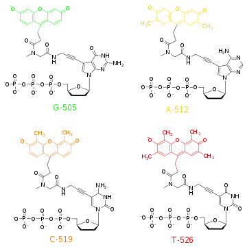 Метод секвенирования с дидезокситерминаторами был существенно усовершенствован, когда радиоактивное мечение праймера было заменено на флуоресцентное мечение терминальных нуклеотидов. На рисунке показана структура дидезоксинуклеозид-трифосфатов, которые содержат флуоресцентные красители, привязанные ковалентными связями к азотистым основаниям. Было обнаружено, что такие модификации азотистых оснований минимально влияют на распознавание трифосфатов ДНК-полимеразами, поэтому они могут встраиваться в синтезированную ДНК наряду с обычными дНТФ. В случае с флуоресцентными дидезокситерминаторами при терминации синтеза ДНК происходит её флуоресцентное мечение. Использование флуоресцентных красителей четырёх цветов для кодирования каждого из природных нуклеозидов позволило проводить синтез в одной пробирке и разделение на одной дорожке геля. Более того, флуоресцентная детекция оказалась более чувствительной и быстрой по сравнению с радиоактивной, позволяя проводить определение нуклеотидов в реальном времени.