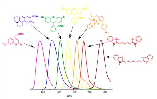 Цвет флуоресценции малых органических красителей может варьироваться в очень широких пределах. Так, например, производные кумарина и флуоресцеина имеют синюю и зелёную флуоресценцию соответственно. Производные родамина и BODIPY могут иметь жёлто-красную флуоресценцию, тогда как на базе цианинов и скваринов созданы красители, которые флуоресцируют в красном и ближнем инфракрасном цвете. Флуоресценцией красителя можно управлять, изменяя природу функциональных групп, присоединённые к флюорофору[34].