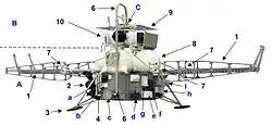 Аппарат стартовой массой ~13 200 кг[2] состоит из маршевой двигательной установки (далее МДУ),[12][13] обеспечивающей выход на траекторию полёта к Марсу и торможение на орбите вокруг Марса, перелётного модуля сухой массой 590 кг[14] и возвращаемого аппарата массой 215 кг.[6] Центральным элементом, или каркасом, аппарата является восьмигранная призматическая конструкция перелётного модуля. На гранях призмы размещается бортовая служебная и научная аппаратура. Электропитание комплекса осуществляется от двух прикреплённых к перелётной ступени панелей солнечных батарей.