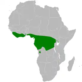 Вид распространён в равнинных влажных тропических лесах Западной и Центральной Африки. Ареал вида соответствует границе произрастания джунглей — от Сьерра-Леоне на западе до Уганды на востоке и Анголы на юге. Изолированная популяция вида, относящаяся к подвиду P. r. bedfordi, обитает на острове Биоко в Гвинейском заливе, где вид связан с окраинами лесов, опушками и вторичными лесами.