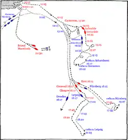 В 13:25, когда немецкие крейсера стали уходить на юго-восток, расстояние между ними и преследователями было 10—12 миль[55]. Максимальная скорость «Дрездена» была 24 узла, «Нюрнберга» — 23,5 и «Лейпцига» — 22,4. Но машины немецких крейсеров были изношены, и их реальная скорость была меньше. «Дрезден» давал 22—23 узла, «Нюрнберг» немного меньше, самым же тихоходным был «Лейпциг», с трудом развивавший 21 узел. Немецкие корабли шли в строю пеленга. В центре «Нюрнберг», слева далеко впереди «Дрезден», правым шёл «Лейпциг»[55].