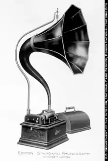 Фоно́граф (от греч. φωνή «звук» + γράφω «писать») — первый прибор для записи и воспроизведения звука. Изобретён Томасом Эдисоном, представлен 21 ноября 1877 года. Звук записывается на носителе в форме дорожки, глубина которой пропорциональна громкости звука. Звуковая дорожка фонографа размещается по цилиндрической спирали на сменном вращающемся барабане (цилиндре). При воспроизведении игла, двигающаяся по канавке, передаёт колебания на упругую мембрану, которая излучает звук. Изобретение стало поразительным событием того времени; дальнейшим развитием фонографа стали граммофон и патефон.