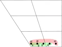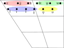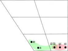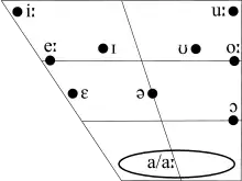 В диалектах Коннахта,[36][37][38] у аллофонов краткой фонемы /a/ язык продвинут вперед, в отличие от долгой /aː/. В диалекте Эррис, например, /a/ перед узкими согласными реализуется как гласный [æ] средне-нижнего подъёма переднего ряда (например, sail [sˠælʲ] «ушная сера»), после узких согласных — как [a] нижнего подъёма (например, geal [ɟalˠ] «яркий»), а между широкими согласными — как централизованный [ɑ̈] заднего ряда (например, capall [ˈkɑ̈pˠəl̪ˠ] «лошадь»). Долгая фонема /aː/, с другой стороны, представлена гласным [ɑː] заднего ряда между широкими согласными (например, bád [bˠɑːd̪ˠ] «лодка»), гласным [ɑ̟ː] перед узкими согласными (например, fáil [fˠɑ̟ːlʲ] «получить») и централизованным [ɑ̈ː] после узких согласных (например, breá [bʲɾʲɑ̈ː] «прекрасный»). В диалекте Турмакади,[39] аллофоны заднего ряда огубляются после широких губно-губных согласных до [ɒː], например, bán [bˠɒːn̪ˠ] («белый»). В диалекте Коннемары только долгота гласной различает фонемы /a/ и /aː/.[40]