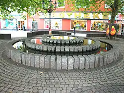 Расположен на стыке торговой площади и Главной улицы (Hauptstraße) Бенрата на месте сломанных домов. Фонтан спроектирован художником Беатой Зассен (Beate Sassen) и архитектором Гельмутом Роде (Helmut Rhode). Строительные работы произведены в 1981 году. Основной строительный материал - гранитные блоки.
