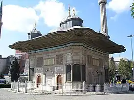 Павильон фонтана Ахмеда III находится на месте византийского фонтана Перайтон. Архитектурное убранство сооружения отражает синтез традиционного османского и современного европейского стилей.