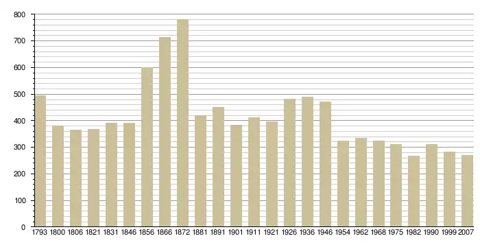 | 1793 | 1800 | 1806 | 1821 | 1831 | 1836 | 1841 | 1846 | 1851 | 1856 | 1861 | 1866 | 1872 | 1876 | 1881 | 1886 | 1891 |