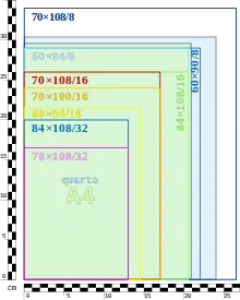 Форматы книг указывают сокращённо, например, вот так — 60×90/16. В этом выражении число «60» обозначает ширину исходного бумажного листа (в сантиметрах), «90» — высоту бумажного листа, а «1/16» — доля листа, получающаяся при его складывании в тетрадь[2]. Чтобы получить число страниц в тетради, надо 16 умножить на два.