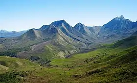 ![]() Вид на заснеженный пик Формоза (справа) и соседние вершины с долины реки Лоттеринг | |