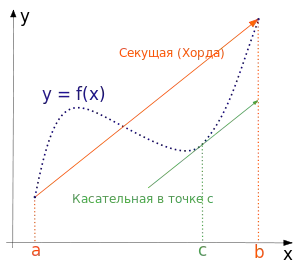 Геометрически это можно переформулировать так: на отрезке найдётся точка, в которой касательная параллельна хорде, проходящей через точки графика, соответствующие концам отрезка.