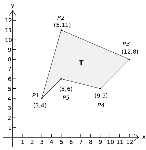 Рассмотрим многоугольник, представленный на рисунке и заданный точками (3, 4), (5, 11), (12, 8), (9, 5), (5, 6):
