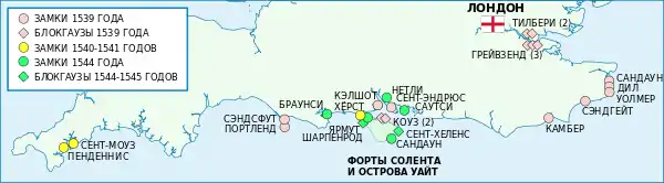 По первоначальной программе 1539 года Генрих VIII запланировал строительство тридцати укреплений: десяти относительно крупных замков и двадцати меньших по размеру каменных и земляных блокгаузов[21]. Фактически в первый год король заложил восемь замков и не менее семи[комм. 5] блокгаузов; всего по первой очереди «Программы» было построено 18 объектов[21]. Укрепления, заложенные в 1539 году, защищали устье Темзы, якорные стоянки и порты Кента, порт Рай и Солент. В 1540—1541 годы были заложены укрепления Фалмута и мощный замок Хёрст на Соленте, в 1544 году (на волне очередной военной тревоги) — новые укрепления Солента и острова Уайт и форт Браунси, защищавший порт Пула[21]. Строившиеся в то же время укрепления Халла[комм. 6], Карлайла, Кале и Гина в число «замков по программе» 1539 года обычно не включаются[21]. Сохранившиеся в Англии замки — лишь части некогда обширной системы, включавшей, помимо капитальных укреплений, многие мили земляных валов и рвов с несохранившимися земляными редутами и бастионами[22].