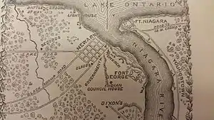 Во время сражения за форт Джордж форт был захвачен американскими войсками в мае 1813 года после двухдневного обстрела из форта Ниагара и американским флотом, после чего последовала жестокая битва. Бригадный генерал Джон Винсент приказал войскам покинуть форт, чтобы свести к минимуму количество жертв.[4] [5] После этого американцы построили здесь свои собственные укрепления [6] и использовали форт в качестве базы для вторжения в Верхнюю Канаду. Это вторжение было остановлено в сражениях при Стони-Крик и Бобровых плотинах. Форт был захвачен британской армией в декабре 1813 года после того, как силы США покинули британскую сторону реки.