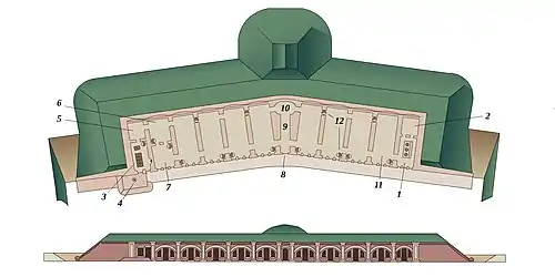 Во внутреннем валу также имелись 8 кирпичных убежищ, по 3 на фасах и по одному на фланках. Каждое убежище — одноэтажный каземат со сводчатым потолком площадью 36 кв. м, который мог служить укрытием для 5-9 человек орудийной прислуги. Полы казематов были сделаны из асфальта, для обогрева в холодное время были установлены утермарковские печи. Закрывались казематы двухстворчатыми деревянными дверями, по обе стороны от дверей имелось по окну для освещения[2].