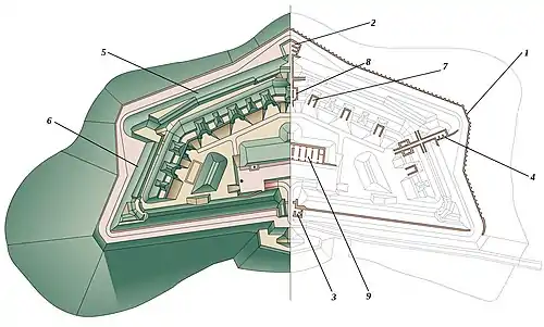 К горже форта примыкали три больших земляных траверса (один в середине и два — по бокам, параллельно фланкам), пересекающие двор укрепления и прикрывающие его от боковых выстрелов[3]. Всего форт мог вместить 250 человек гарнизона и около 20-ти орудий[4].