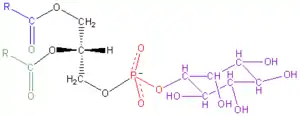 Фосфатидилинозитол состоит из глицериновой основы, к которой в положениях 1 и 2 присоединены две жирнокислотные цепи, а в положении 3 — фосфатная группа и инозитол. Инозитол, шестиосновный циклический спирт, находится в молекуле фосфатидилинозитола в стереоизомерной форме мио-инозитол.