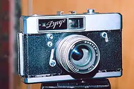 | Друг Зоркий-7 1960-1962 | КМЗ | Малоформатный дальномерный фотоаппарат. Крепление объективов — резьба M39×1/28,8, в поле зрения видоискателя — кадровая рамка для объективов с фокусным расстоянием 50 и 85 мм. Шторный затвор. Особенность конструкции — ручной привод взвода затвора и перемотки плёнки по принципу приставки Leicavit (фотоаппараты семейства Leica M). См. фото приставки. | |