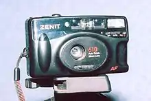 | Зенит-610 2000-2002 | КМЗ | Малоформатный компактный фотоаппарат с автоматической фокусировкой. Корпус пластмассовый бесфутлярной конструкции. Взвод затвора, перемотка плёнки и обратная перемотка — встроенным электроприводом. Автомат с приоритетом единственной выдержки. Ввод значений светочувствительности фотоплёнки — DX-кодом. Встроенная фотовспышка с автоматическим или принудительным включением. | |