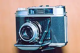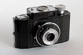| Москва-2 1947-1956 | ![]() | КМЗ | Среднеформатный дальномерный фотоаппарат, складной (с мехом) корпус. Центральный затвор. Плёнка типа 120, размер кадра 6×9 см. Камера создана на базе фотоаппарата «Zeiss Super Ikonta» (вариант «C», модель 531/2) немецкой фирмы Zeiss Ikon. |
