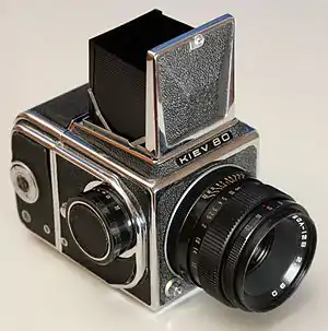 | Киев-88 Киев-88 TTL 1979-1990-е | ![]() ![]() | Арсенал | Среднеформатный однообъективный зеркальный фотоаппарат модульной компоновки. Разработан на основе камеры «Салют-С». Плёнка типа 120, размер кадра 6×6 см. Крепление объективов — байонет В. Видоискатель сменный, светозащитная шахта или пентапризма. Модель «Киев-88 TTL» комплектуется пентапризменным видоискателем с несопряжённым TTL-экспонометром со светодиодной индикацией. С 1990-х годов начат выпуск модифицированных моделей «Киев-88 СМ» и «Arax», в том числе с байонетом Б, кассетами на размер кадра 4,5×6 см (в том числе для плёнки типа 220), цифровыми адаптерами и другими принадлежностями. |