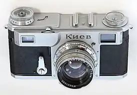 | Киев-3 1952-1955 | Свободное изображение отсутствует | Арсенал | Малоформатный дальномерный фотоаппарат, копия немецкой камеры «Contax III». Селеновый экспонометр. Фотографический затвор с гибкими металлическими шторками из звеньев, крепление объективов — байонет Contax-Киев. |